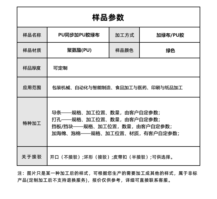 產(chǎn)品名稱:PU同步帶加PU膠綠布耐磨防滑食品包裝自動化生產(chǎn)線傳動帶廠家定制