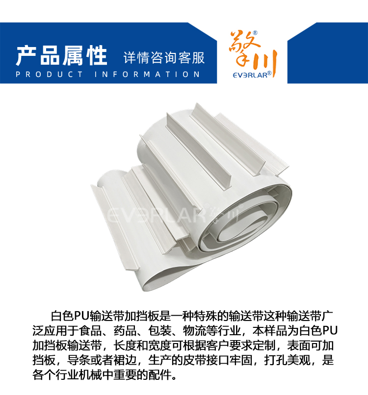 產(chǎn)品名稱:食品級白色PU輸送帶加擋板防滑落耐磨食品包裝分揀線傳送帶定制