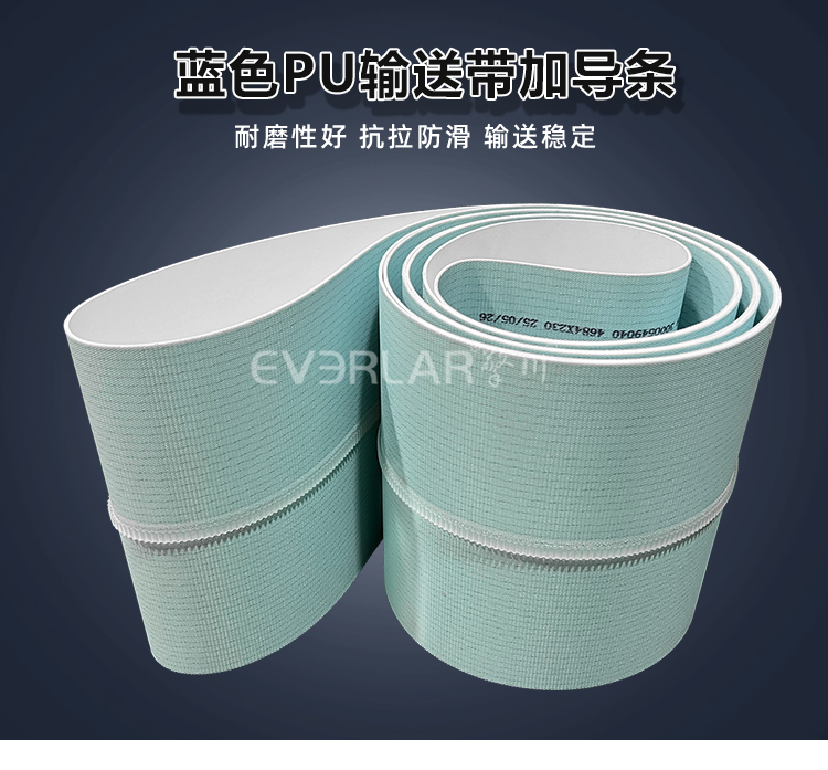 產(chǎn)品名稱:食品級(jí)藍(lán)色PU輸送帶加導(dǎo)條防滑易清潔食品醫(yī)藥輸送機(jī)傳輸帶定制