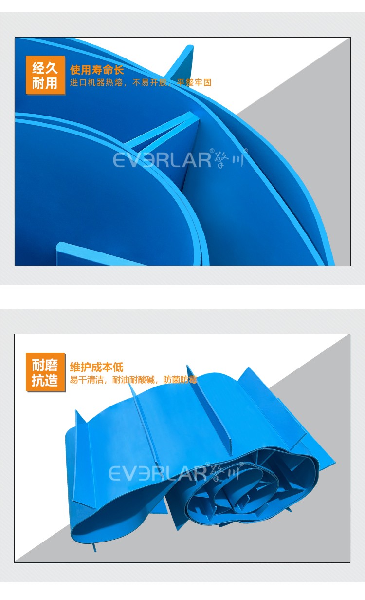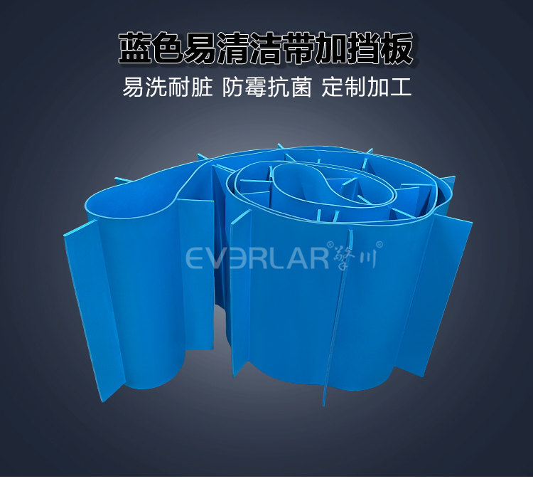 產(chǎn)品名稱:藍(lán)色易潔帶加擋板食品級(jí)耐油防霉膨化食品提升機(jī)輸送帶