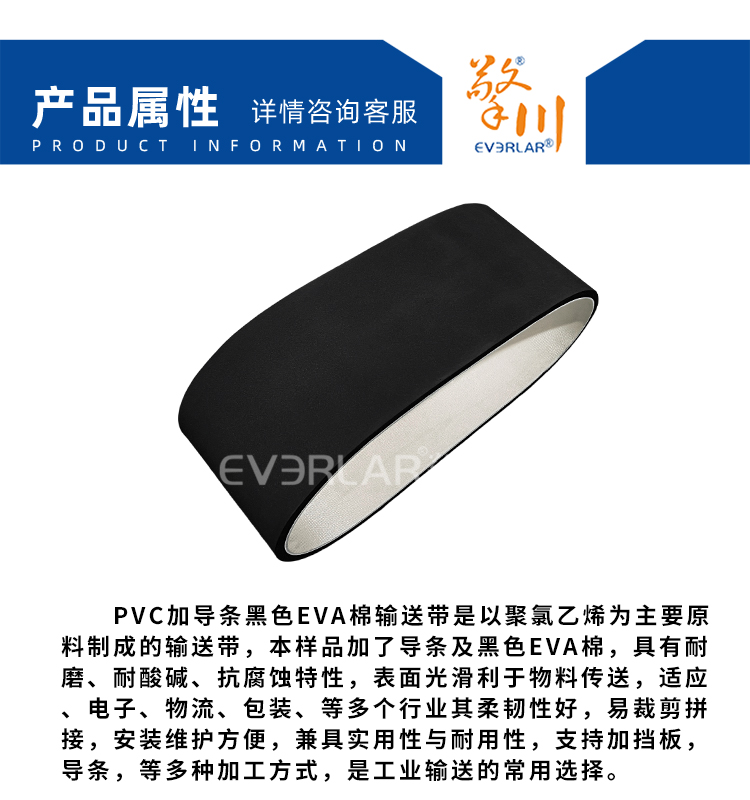 • 產(chǎn)品名稱:PVC加導條黑色EVA棉輸送帶耐酸堿減震電子行業(yè)精密元件傳輸皮帶定制