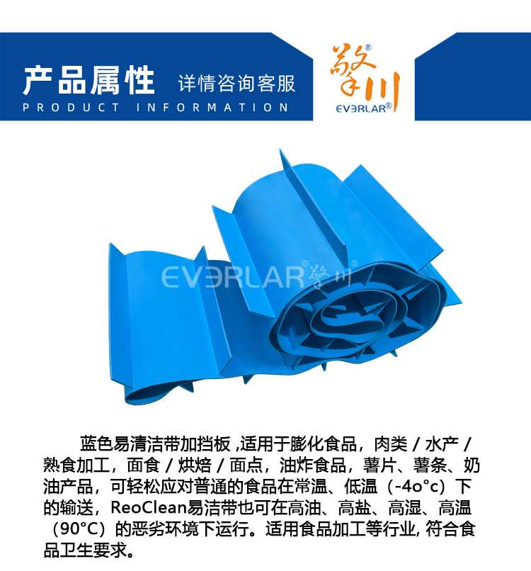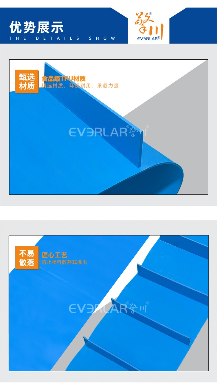 產(chǎn)品名稱:藍(lán)色易潔帶加擋板食品級(jí)耐油防霉膨化食品提升機(jī)輸送帶